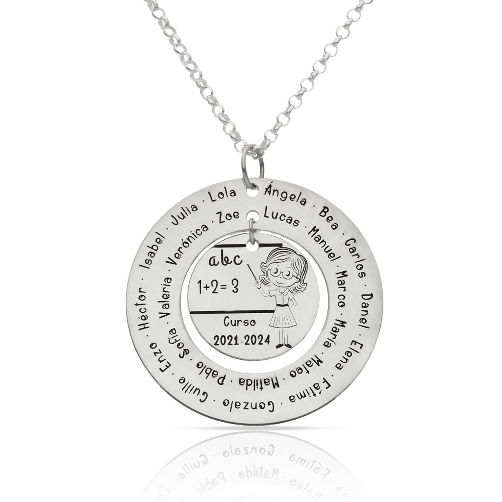 Gargantilla en Plata de Ley 925mm con dibujo de maestra + cerco con los nombres de los alumnos.