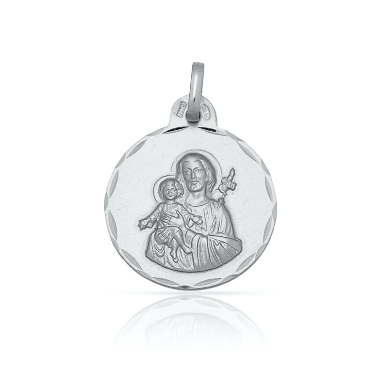 Medalla de San Jose en Plata de Ley 925mm con borde tallado y forma redonda.