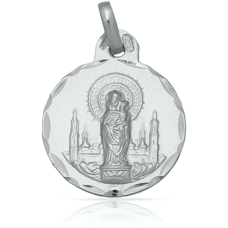 Medalla Virgen del Pilar en Plata de Ley 925mm con borde tallado y forma redonda.