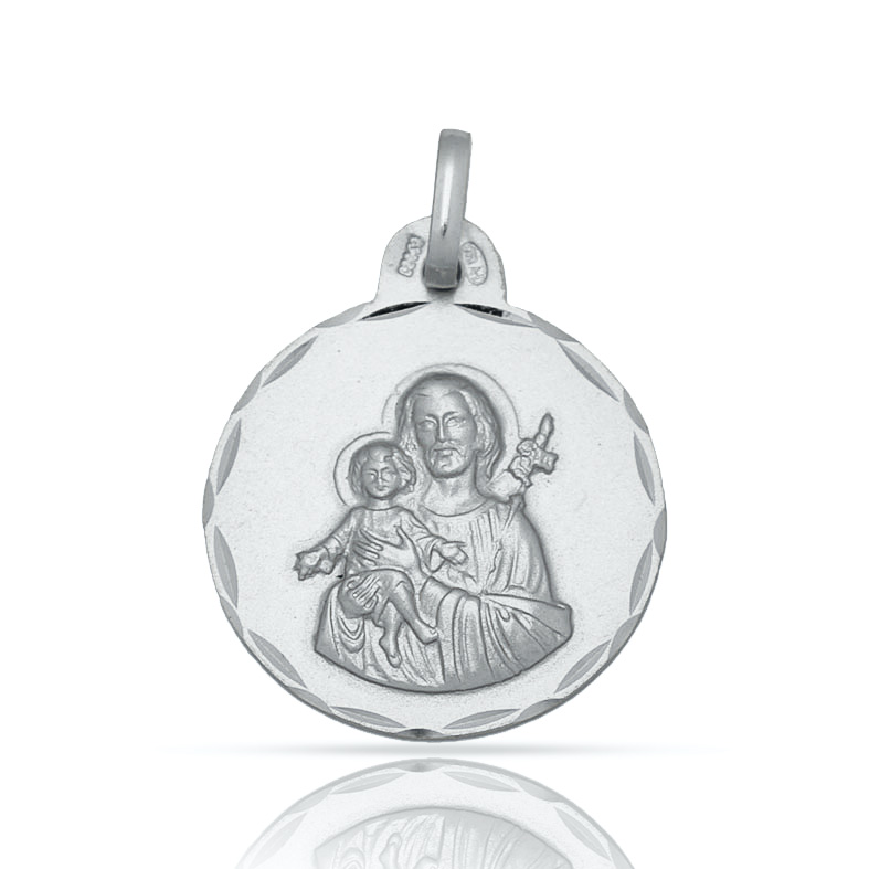 Medalla de San Jose en Plata de Ley 925mm con borde tallado y forma redonda.