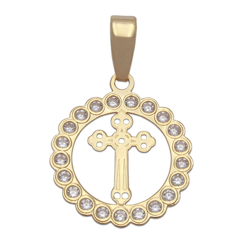 Colgante redondo en Oro 18 Kl. con la cruz asturiana. Cerco de circonitas.