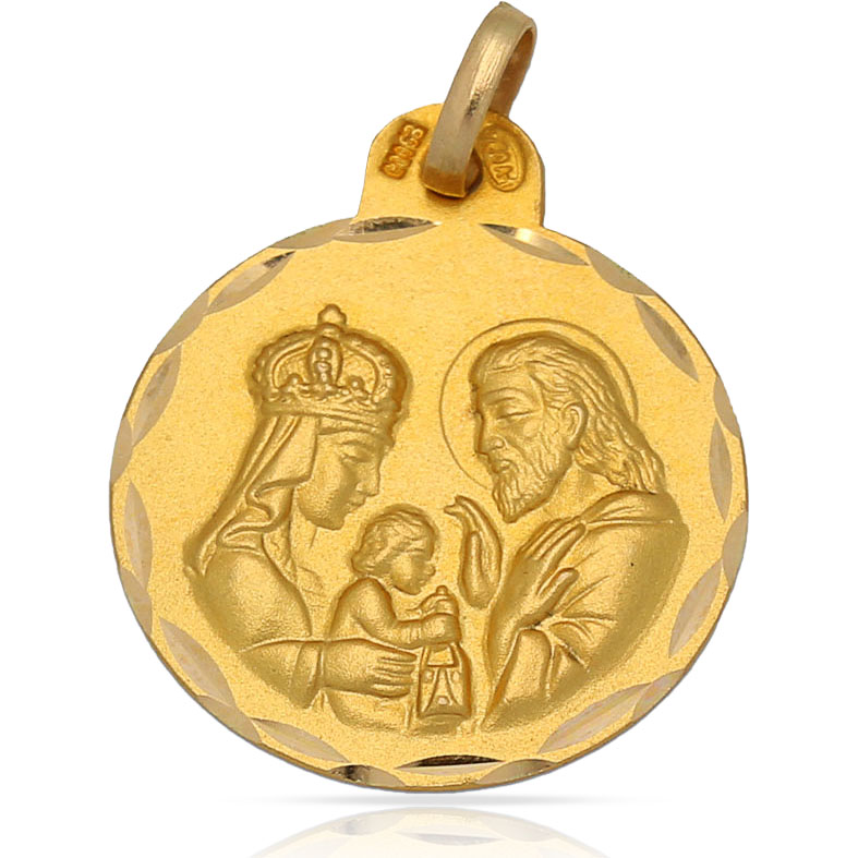 Medalla de La Sagrada Familia en Oro de 18 Kl con borde tallado y forma redonda.