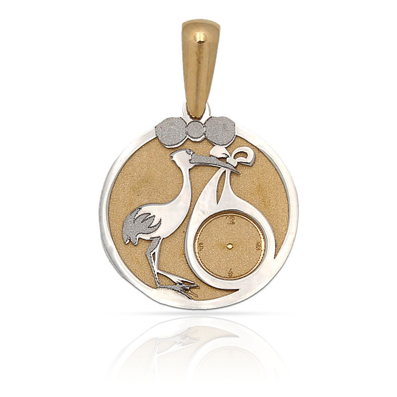 Medalla de bebé bicolor en Oro de 18 Kl. con cigüeña y reloj.