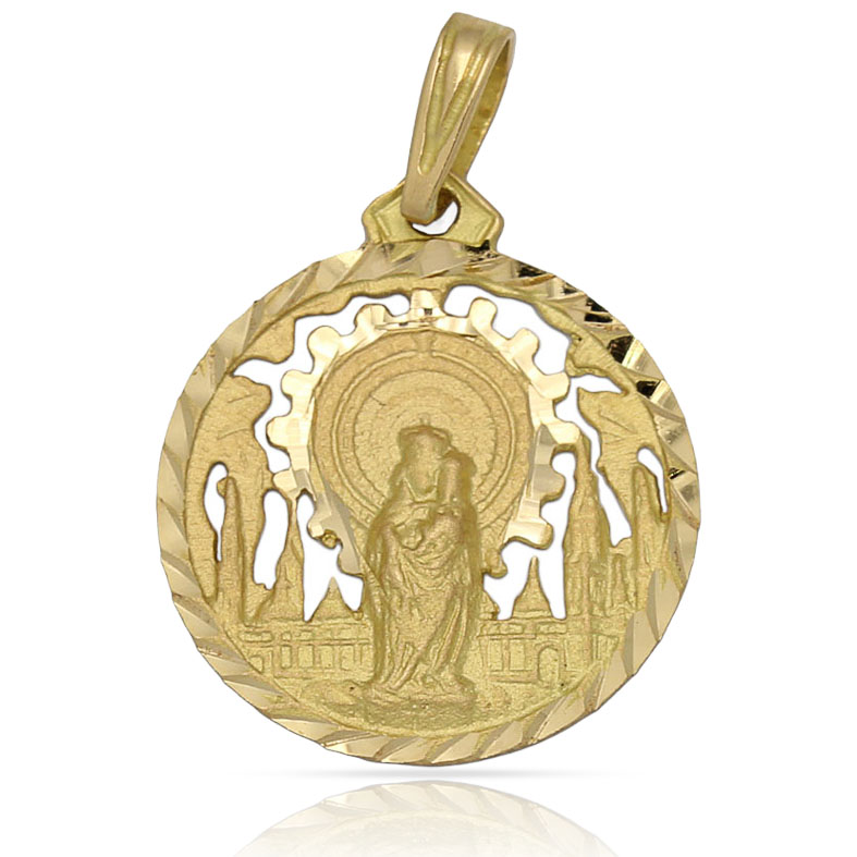 Medalla Virgen del Pilar en Oro 18KL calada, de forma redonda y borde tallado.