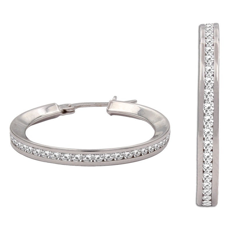 Aros en Oro blanco de 18 Kl. con circonitas. Terminación en brillo. Ancho de 2.5mm. Diámetro interior: 20mm.