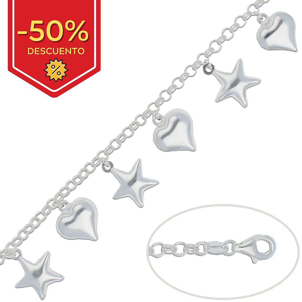 Pulsera de estrellas y corazones en Plata de Ley 925mm. Terminación en brillo. Cadena rolot de 4mm.