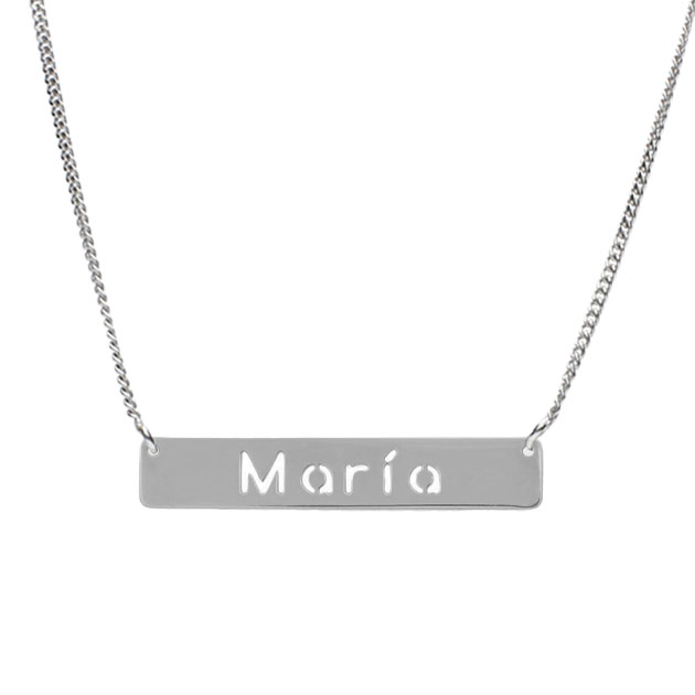 Colgante de nombre en Plata de Ley 925mm con nombre calado. Medidas del letrero: 5x28mm.