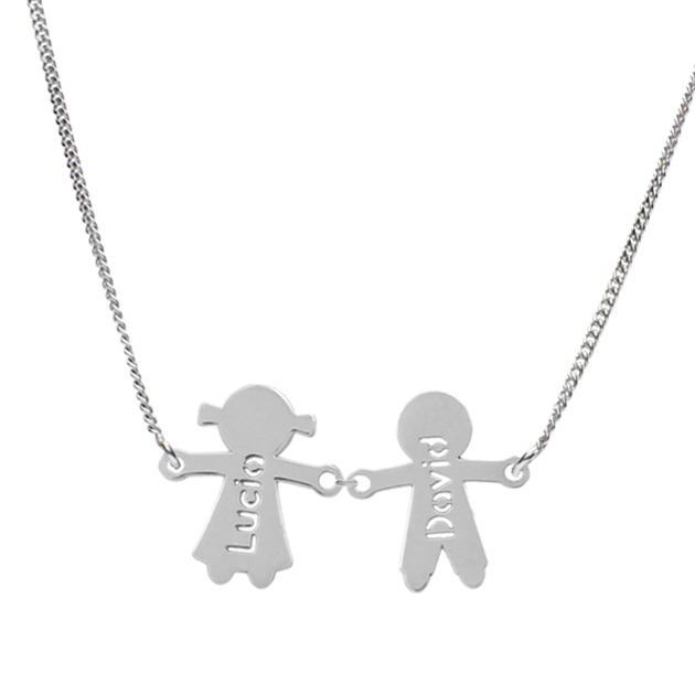 Gargantilla de niño + niña en Plata de Ley 925mm con opción de personalizar con nombres calados. Terminación en brillo.