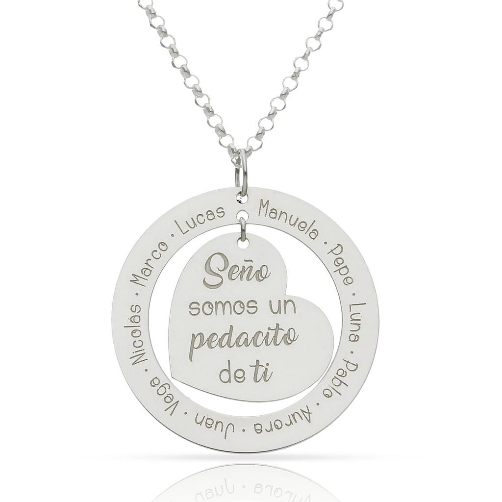Gargantilla en Plata de Ley 925mm con frase en el corazón: SEÑO SOMOS UN PEDACITO DE TI y cerco con los nombres de los alumnos.