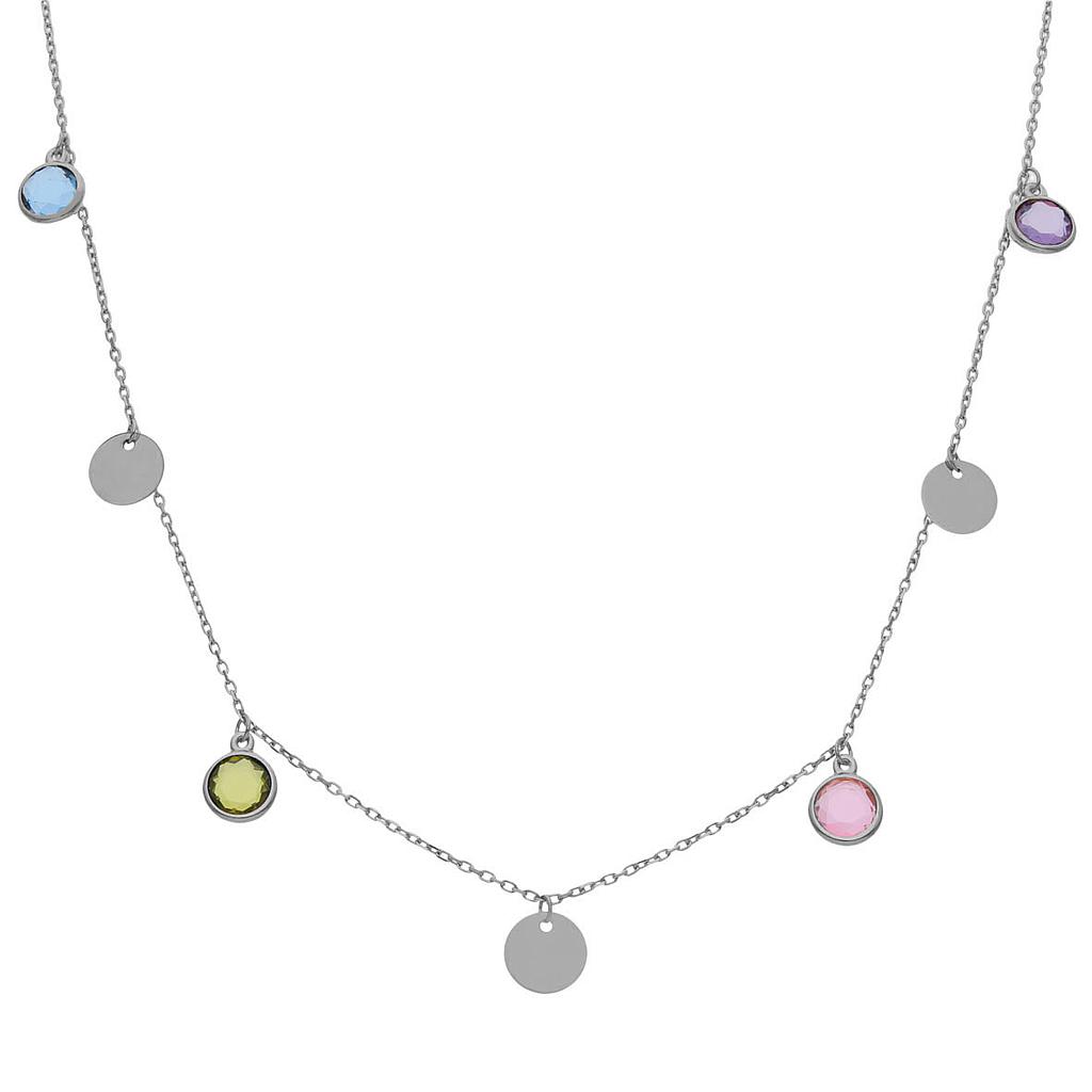 Gargantilla en Plata de Ley con mini charms de círculos + 4 piedras en color azul, verde, rosa y violeta.