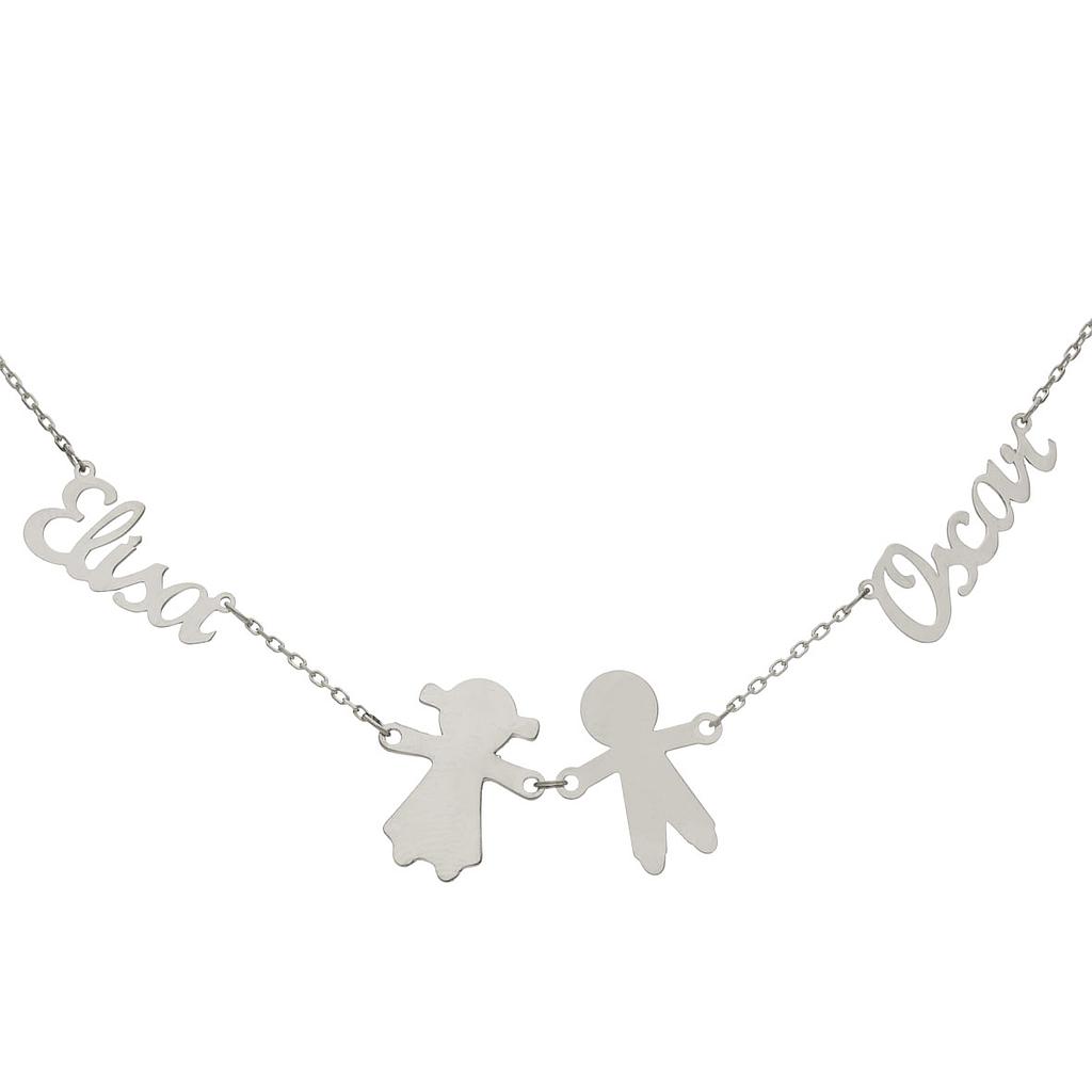 Gargantilla en Oro blanco de 18 Kl. con dos nombres + niño + niña.