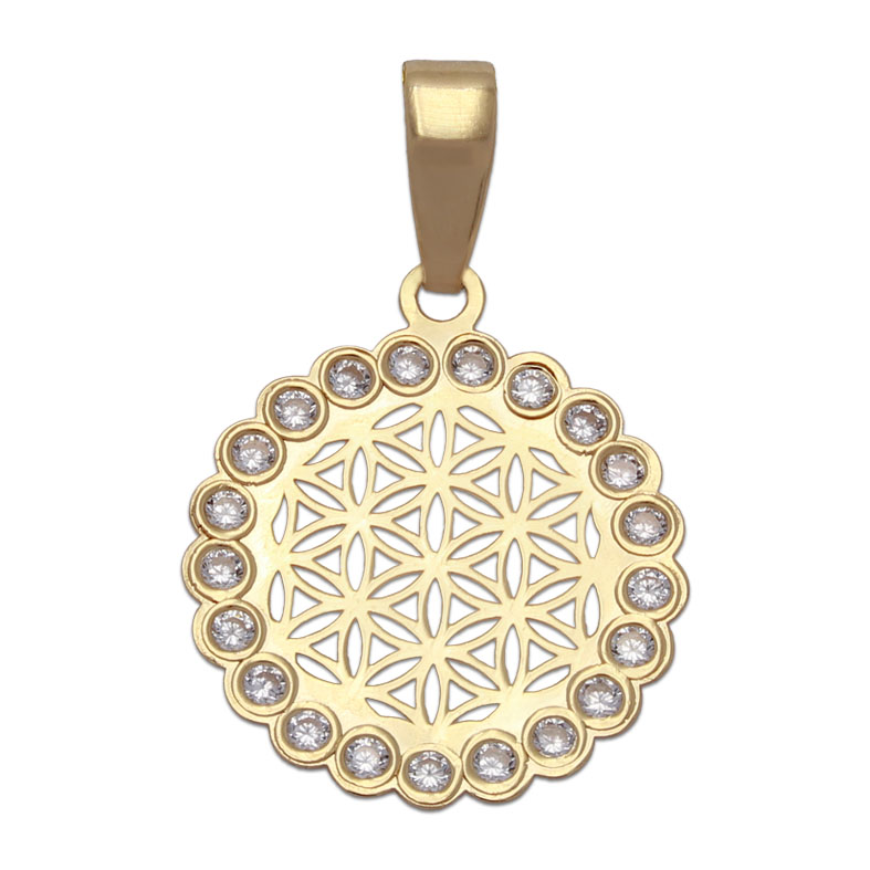 Colgante redondo calado en Oro 18 Kl. cerco de circonitas. Terminación en brillo.
