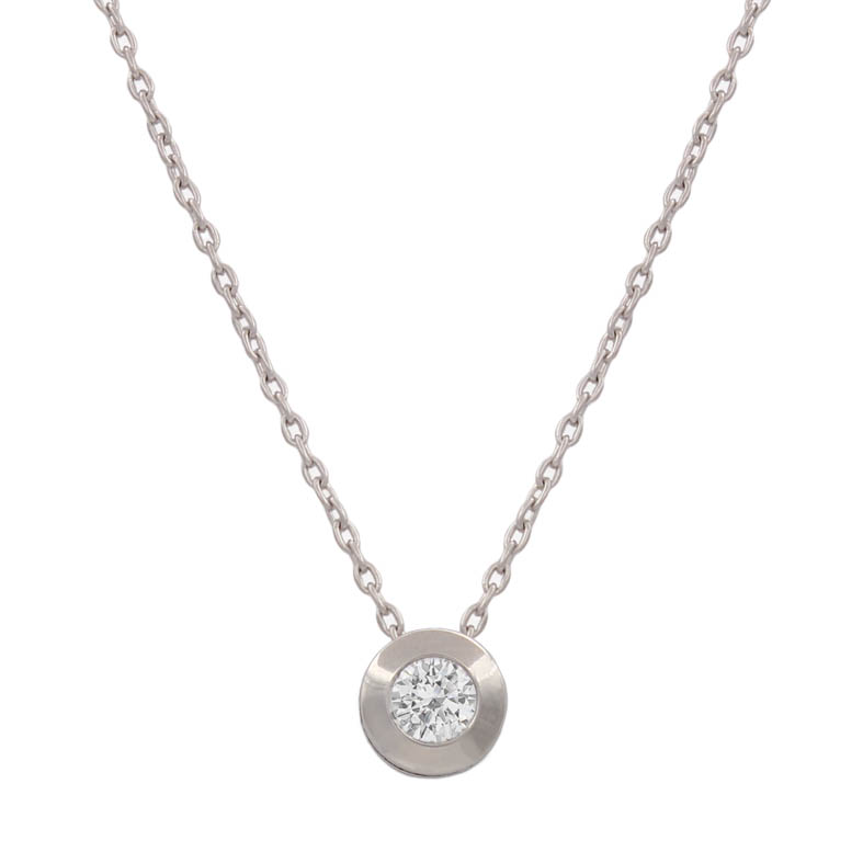 Gargantilla con chatón en Oro blanco de 18 Kl. con circonita. Parte trasera forrada. Terminación en brillo. Medidas del colgante: 7mm.