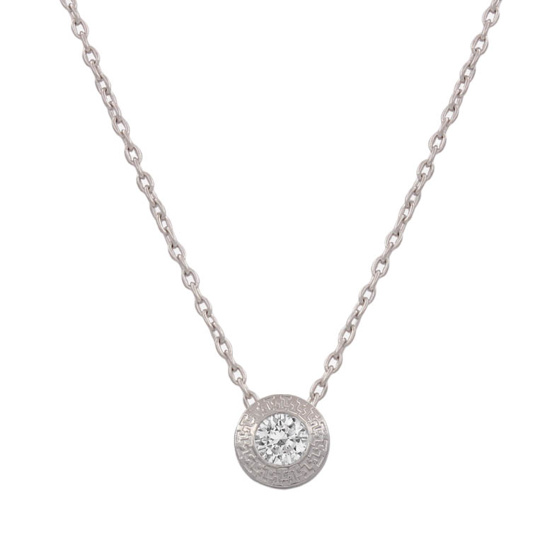 Gargantilla con chatón en Oro Blanco de 18 Kl. con greca y circonita. Parte trasera forrada. Terminación en brillo. Medidas del colgante: 7mm.