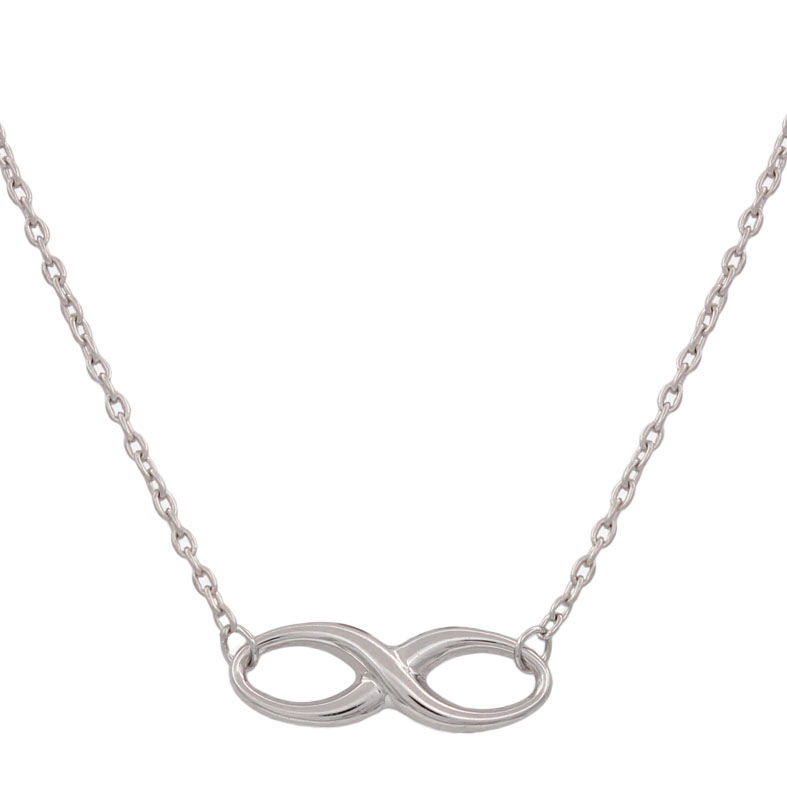 Gargantilla infinito en Oro blanco de 18 Kl. con tallados. Terminación en brillo. Medidas del colgante: 5x15mm.