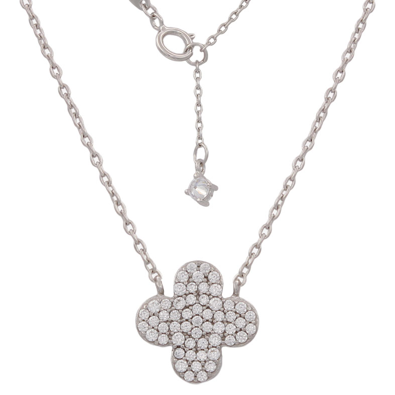 Gargantilla en Oro blanco 18 Kl. con colgante de flor con circonitas. Terminación en brillo. Medidas del colgante: 9mm.