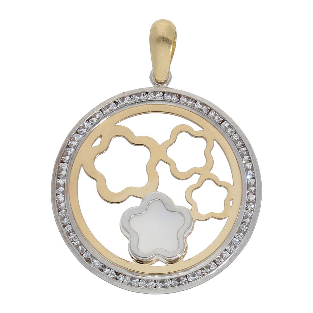 Colgante bicolor en Oro de 18 Kl. con piedra nácar en una flor. Cerco de circonitas.