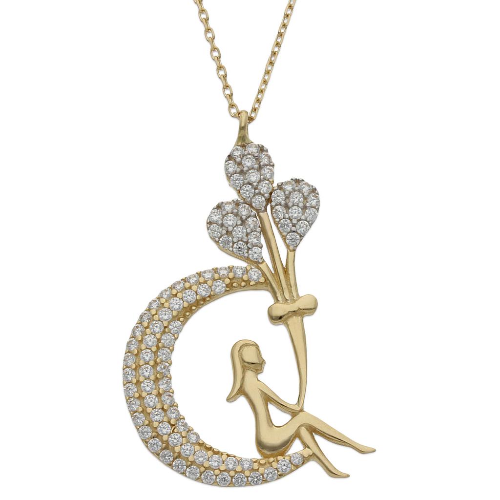 Colgante luna + globos + mujer en Oro de 18 Kl. con circonitas. Terminación en brillo. Medidas del colgante: 17x30mm.