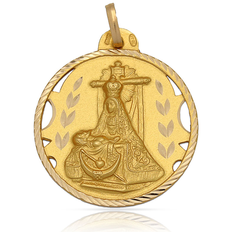 Medalla Virgen de las Angustias calada en Oro de 18 Kl, con borde tallado y forma redonda.