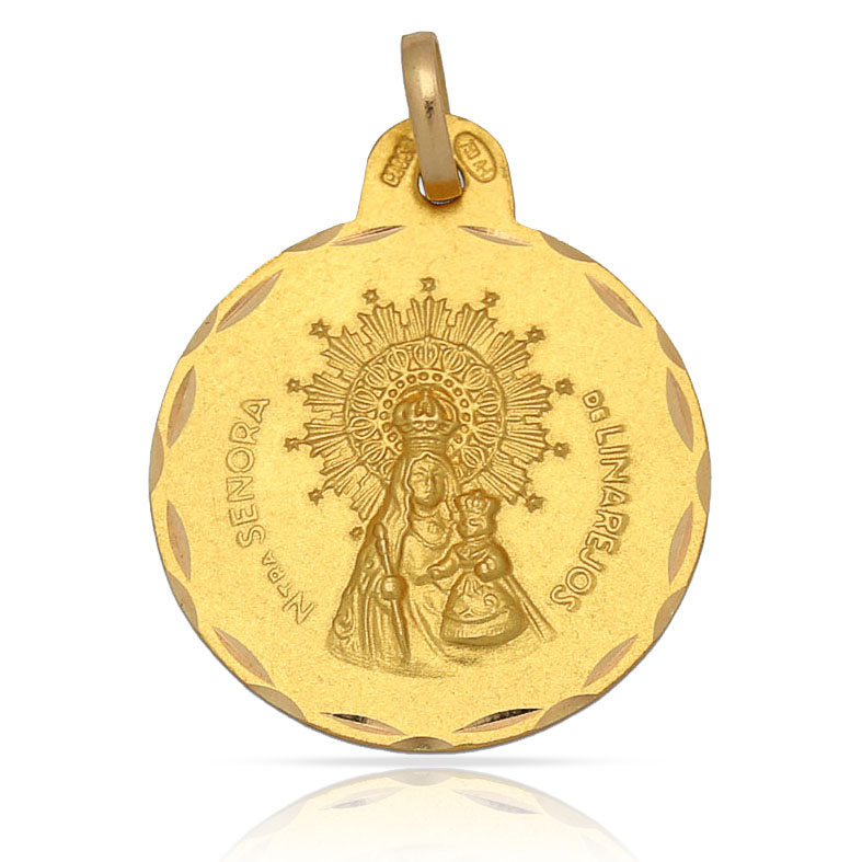Medalla Virgen de Linarejos en Oro amarillo de 18 Kl con borde tallado y forma redonda.