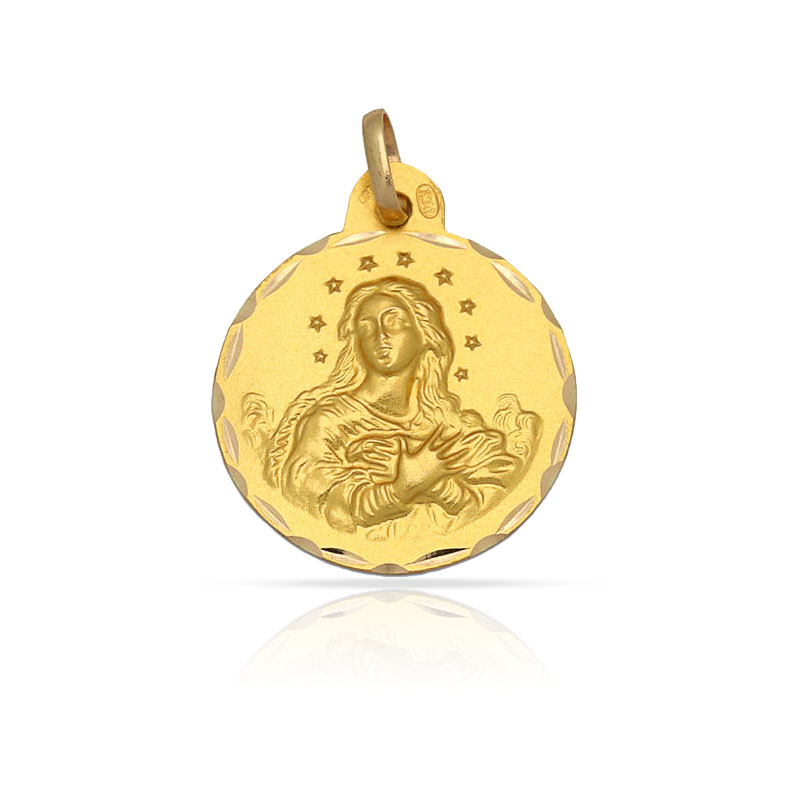Medalla Virgen Inmaculada o Purísima en Oro amarillo de 18 Kl con borde tallado y forma redonda.