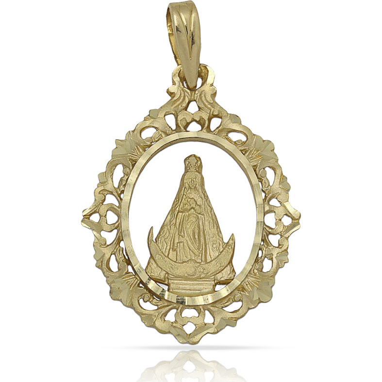 Medalla Virgen Olmo en Oro amarillo de 18 Kl en silueta con cerco de filigrana y forma ovalada.