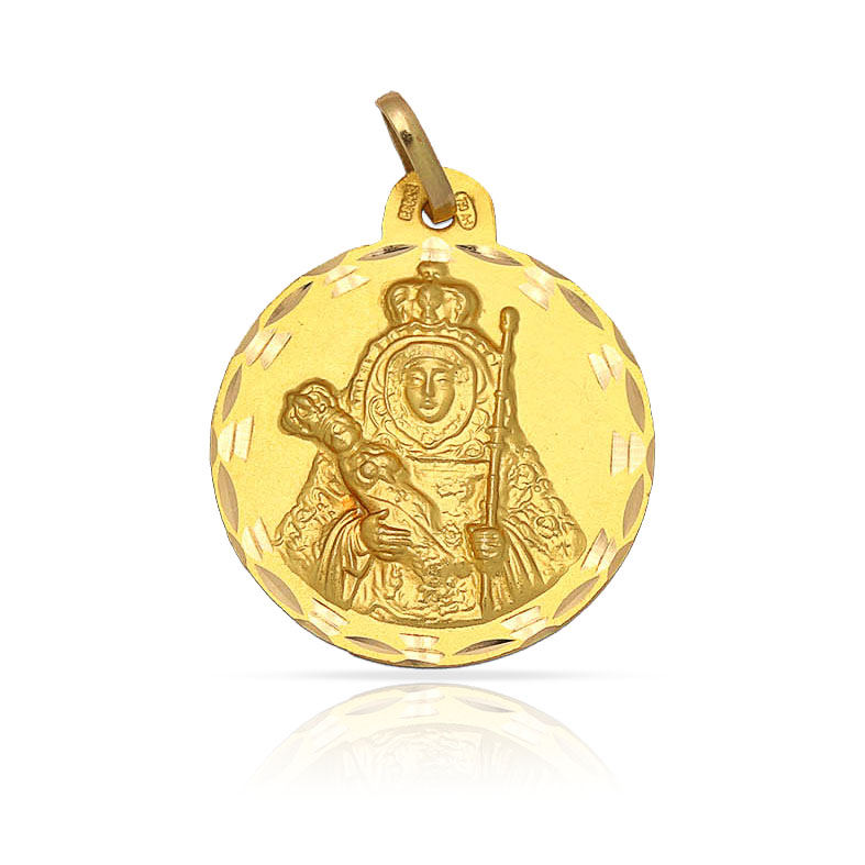 Medalla Virgen de la Candelaria en Oro amarillo de 18 Kl con borde tallado y forma redonda.