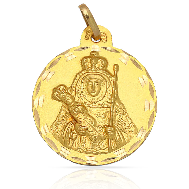 Medalla Virgen de la Candelaria en Oro amarillo de 18 Kl con borde tallado y forma redonda.