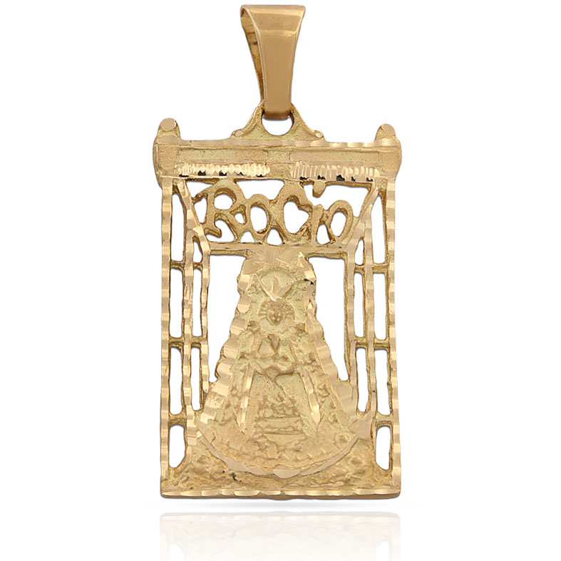 Medalla Virgen del Rocio en Oro amarillo de 18 Kl con forma rectangular y calada.