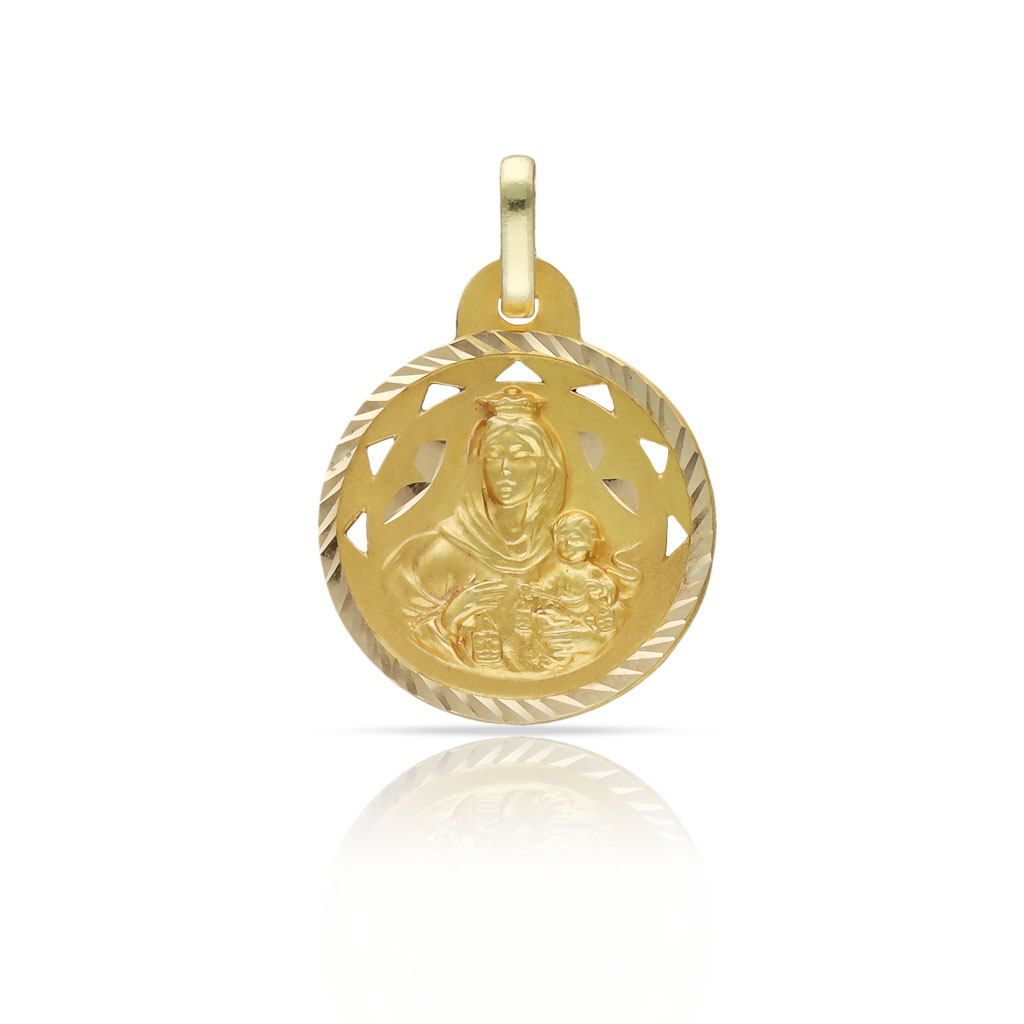 Medalla Virgen del Carmen calada en Oro amarillo de 18 Kl con borde tallado.