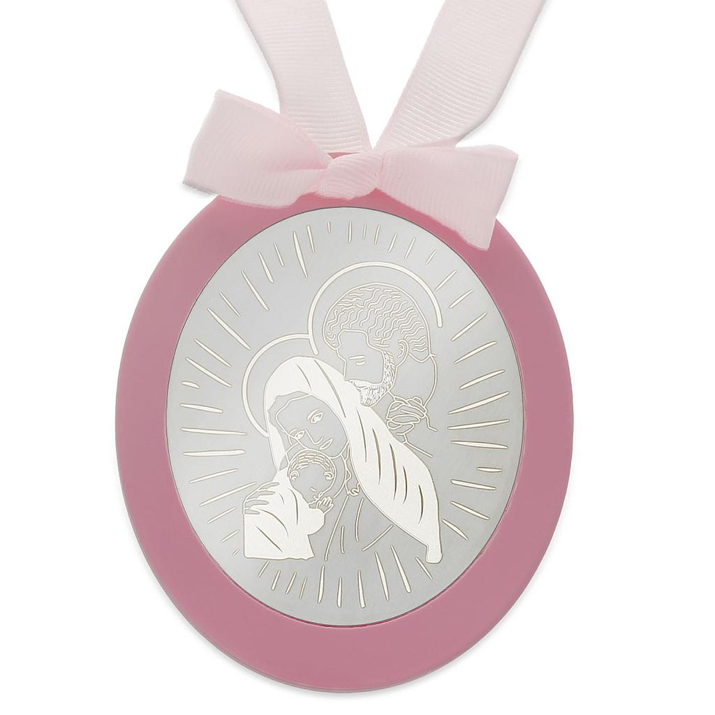 Medalla de cuna con chapa ovalada grabada con la Sagrada Familia en Plata de Ley 925mm. Terminación en mate y grabado a láser .