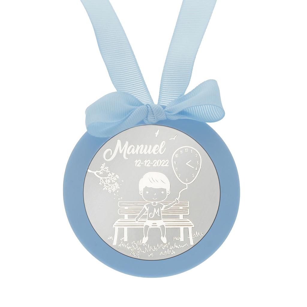 MEDALLA CUNA PLATA 925MM REDONDA NIÑO + GLOBO